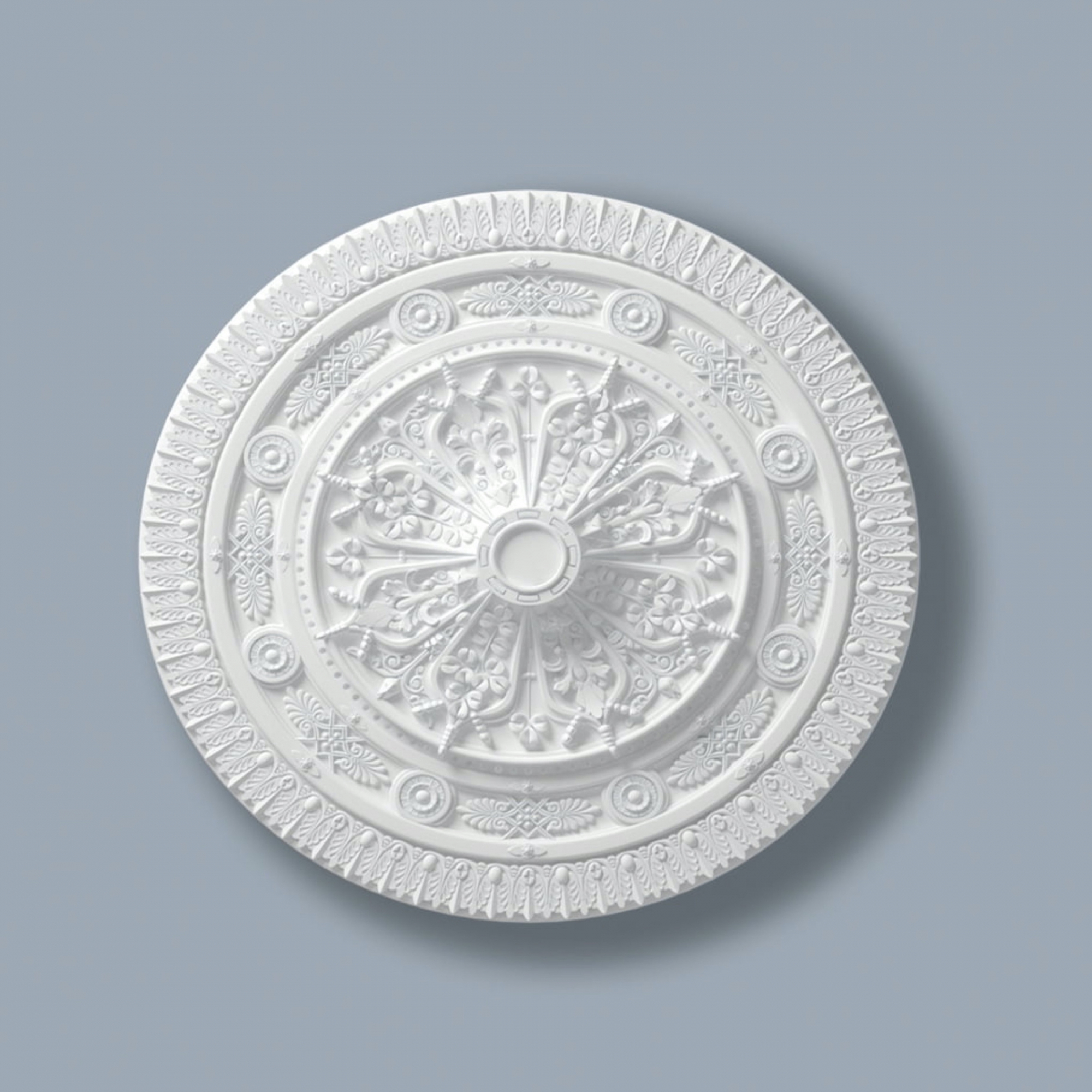 Kæmpe stor stukroset på næsten en meter i diameter, med masser af detaljer, samt et lille fladt felt i midten, hvor du kan bore hul til strøm fra loftdåsen.