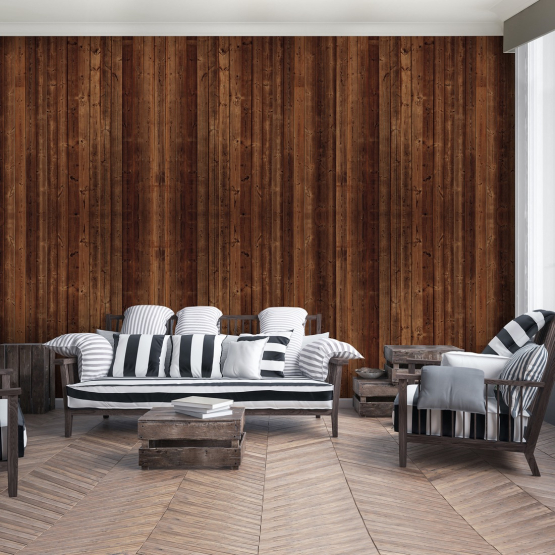 Flot fototapet med billede af mørkebrune træplanker, som giver din væg et rustikt look.